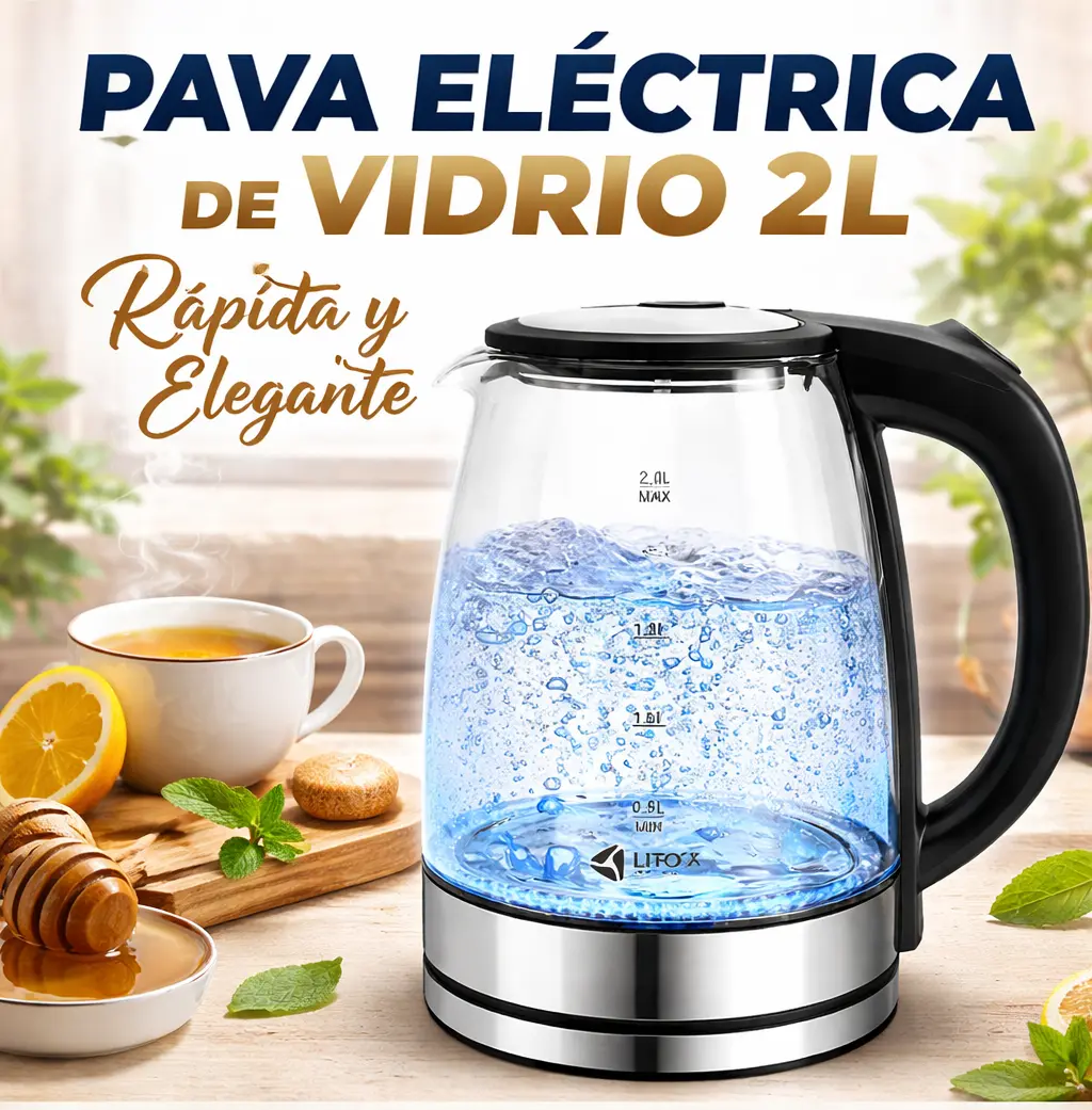 Pava eléctrica de vidrio ORYX de 2 litros con calentamiento rápido de 1500W. Cuenta con iluminación LED, base giratoria 360° y diseño moderno que permite ver el proceso de ebullición. Ideal para preparar mate, té o café de forma práctica y rápida.